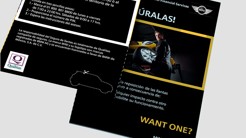 Diseño y producción de tarjetas plásticas y sobre para póliza de seguro de llantas, en colaboración con MINI.